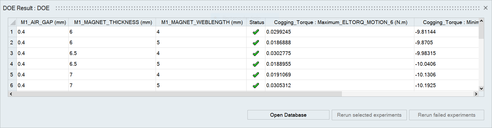 The “Update” option in RMB click on “Results” in the DOE solution start executing the experiments. The status of each experiment will be updated in the DOE table. User can select a maximum of 4 experiments by selecting the row to open the database by clicking “Open Database”.