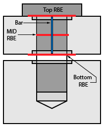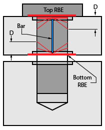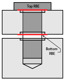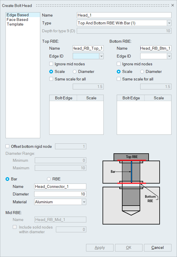 A bolt is modelled as 2 parts, the head and the tail. The head portion can be modelled in one of several ways. This dialog box shows the different options as pictures. Commonly the head part of the bolt consists of top and bottom RBE connected by a bar. To create the head part of the bolt, the bolt holes have to be identified. This can be done by manually selecting single edge on top and bottom of the holes. This is referred to as �Edge Based�. At a time more than one set of top and bottom edges can be selected to create multiple head RBE. It is possible that a model can have a lot of bolts and it makes it difficult to manually pick each of the edges to model the bolt head. So another option is provided to model bolt heads on all the holes on a face. For this the user has to select a face. In addition the user also has to specify the Min and Max Diameter so that the head RBEs will be created for the bolt holes within this range of diameter. For this behaviour the user has to select the option Face Based.
