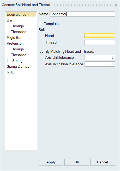 Set environment variable "set SL_CREATE_1D_BOLT_USING_TEMPLATES=true" to enable "Template" option. User can define connector definition without selecting any head/thread. All the input given will be stored as template for connector definition and will be listed under "Automation Object" in "Loads and Constraints" browser. This template can be further used in 1d bolt creation.