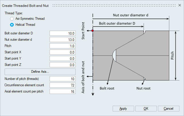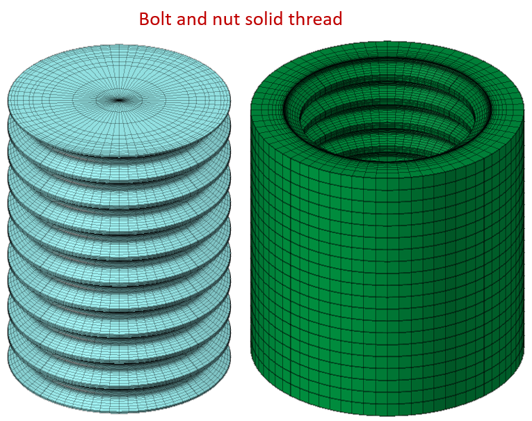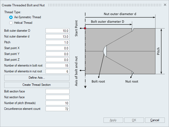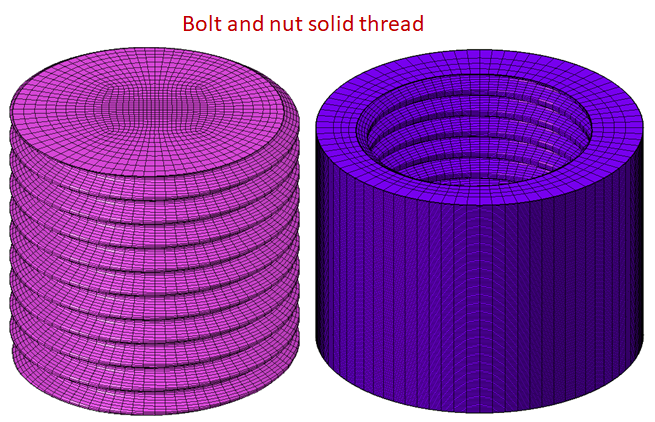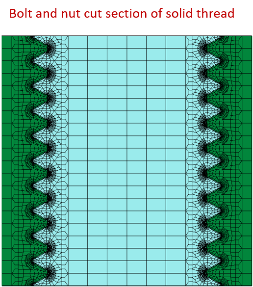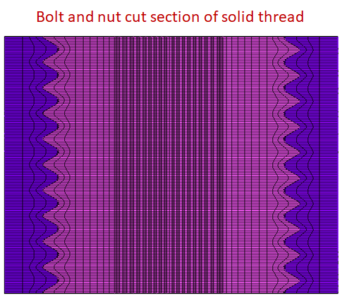 This will create axi-symmetric threaded portion of bolt and nut in specific mesh pattern based on the given bolt and nut parameters. First user needs to create the half symmetry thread section using the create thread section option. Then the created section faces can be given as inputs for bolt and nut faces to create threaded bolt and nut.
