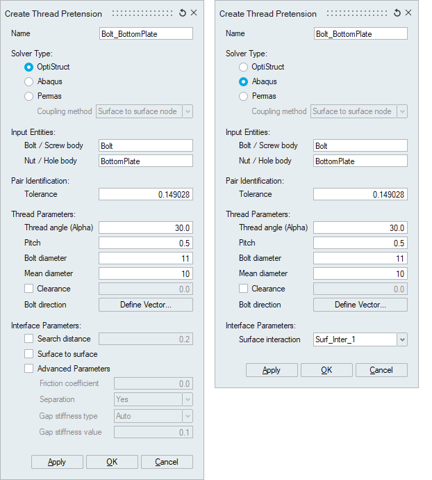 • The following parameters are common for both OptiStruct and Abaqus thread pretension,