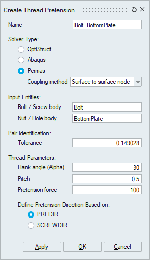 Permas $PRETENSION THREAD SURFACE TO SURFNODE/GROUND (SCREWDIR/PREDIR) = {Coordinate info/Vector} ALPHA = {value} PITCH = {value}