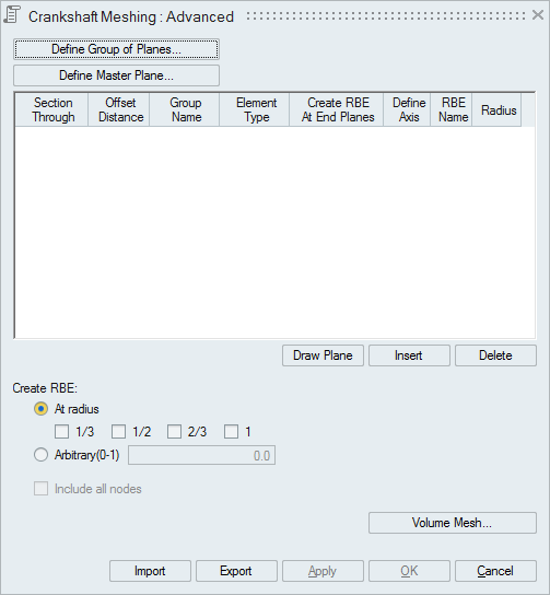 We creates internal faces to the solid at the specified plane locations. Oil holes that cross the plane will also be broken by the plane. At each internal face, RBEs will be created with the master node on the axis of the journal or pin and the slave nodes at a requested radius from the axis.