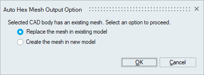 - CAD Body: The below dialog will prompt the user to select the output location if an equivalent mesh is already present. For more details, please refer Mesh output options for CAD body.