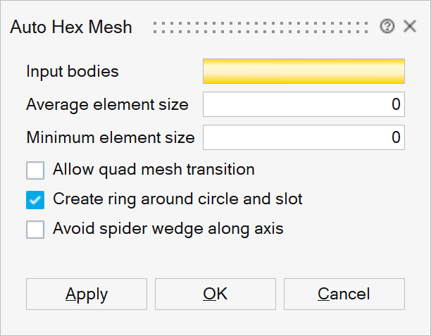 This tool is used to automatically hex mesh bodies based on body types. The user should specify the average and minimum element size for meshing.