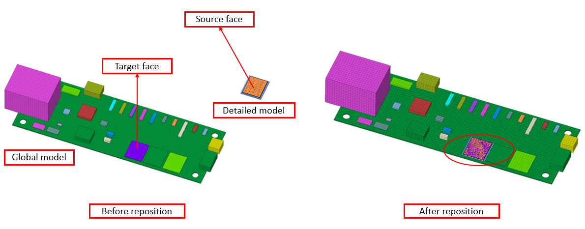 This tool helps you automatically reposition a detailed sub-model (or local model) within the global PCB model to enable seamless global-to-local mapping. The user needs to select one face from the sub-model and the corresponding face from the global model, the tool will transform the sub-model so that the centroids of the selected faces are aligned, effectively positioning the sub-model.