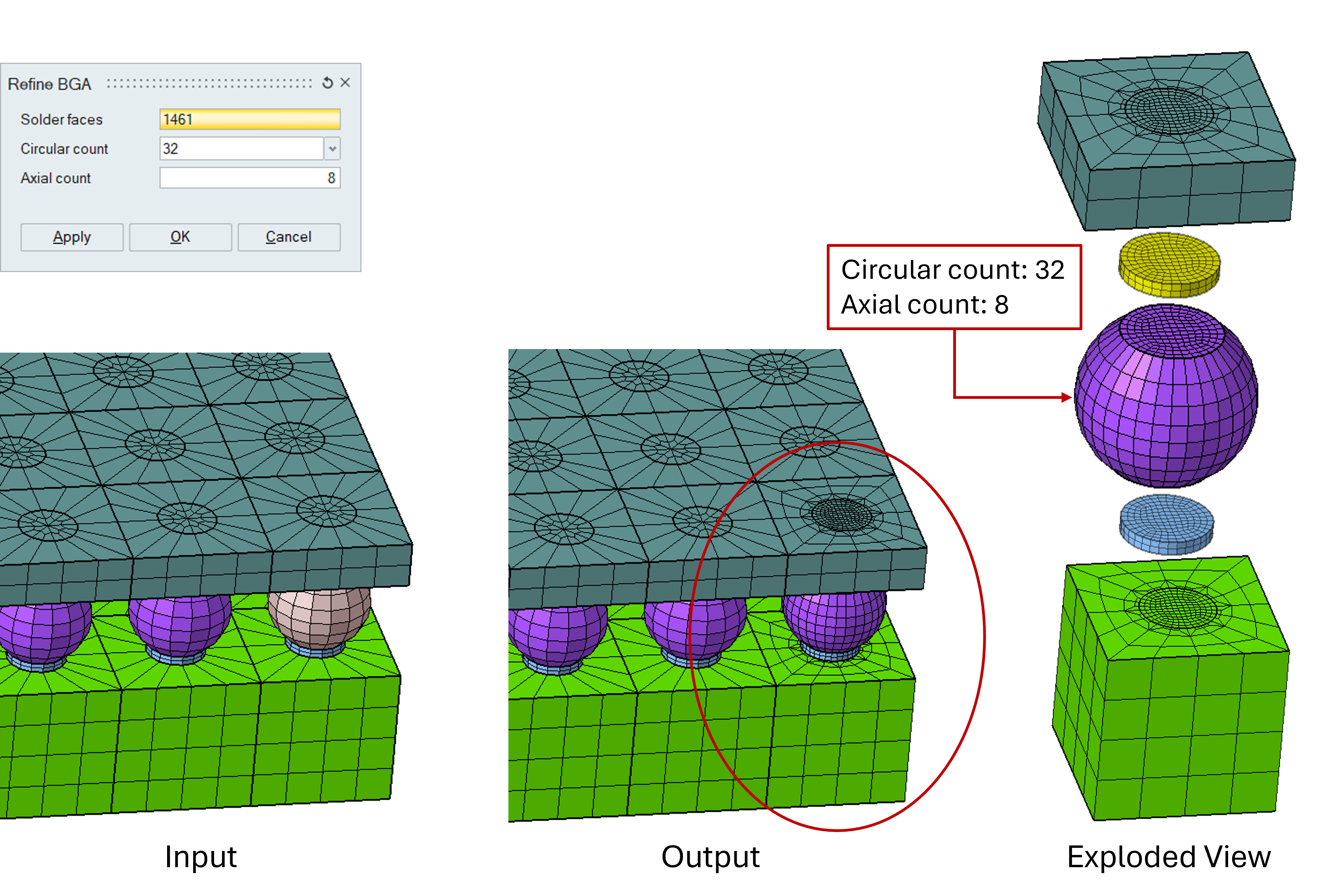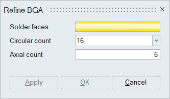 This tool is used to refine the BGAs on the regions of interest. After refinement, the BGA mesh pattern is updated on the copper pads, package, and board. BGA refinement is supported for all the BGA mesh types created in SimLab. For more details, please refer Create BGA.