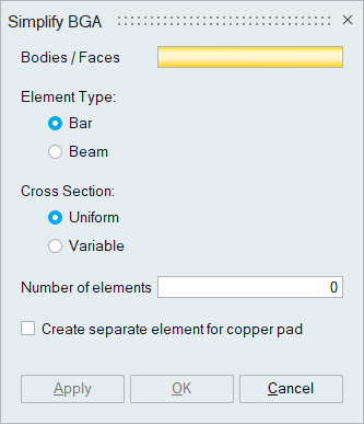 This tool is used to simplify the BGAs with RBE’s and 1D elements. RBE’s are created at the top and bottom of the BGA and they are connected by the 1D elements. Bar/Beam properties will be assigned to the 1D elements automatically.