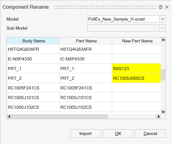 Users can either type in the new part name or can import a csv file consisting of existing part names and new part names and click on OK to rename the parts.