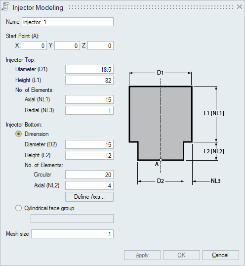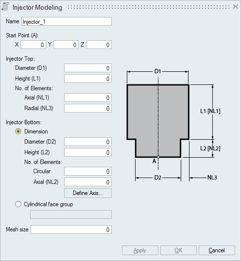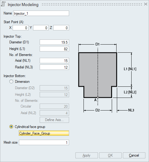 This option is used to directly get the dimension of the Injector bottom from the cylindrical face group selected. This will automatically get the values of D2, No. of Elements, L2, NL2 and axis from the face group selected. But the parameters of injector top has to be entered.