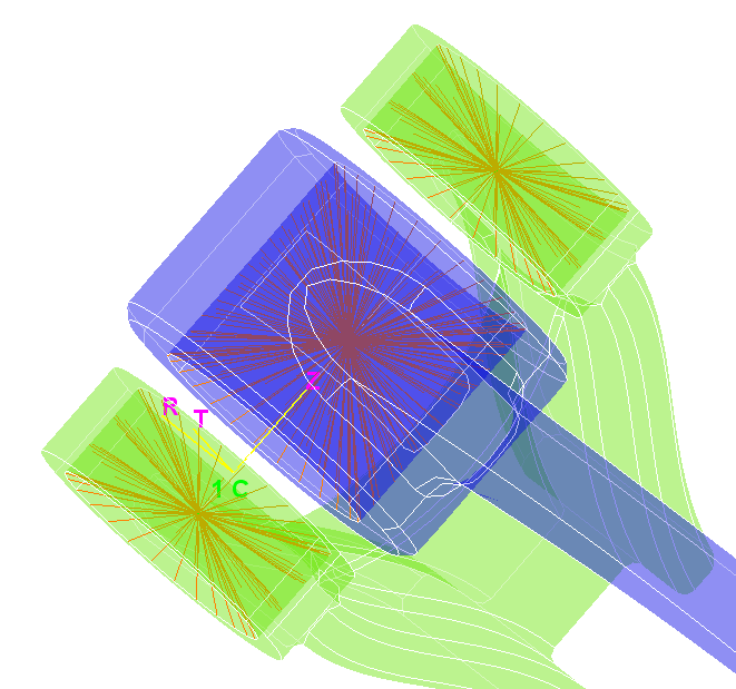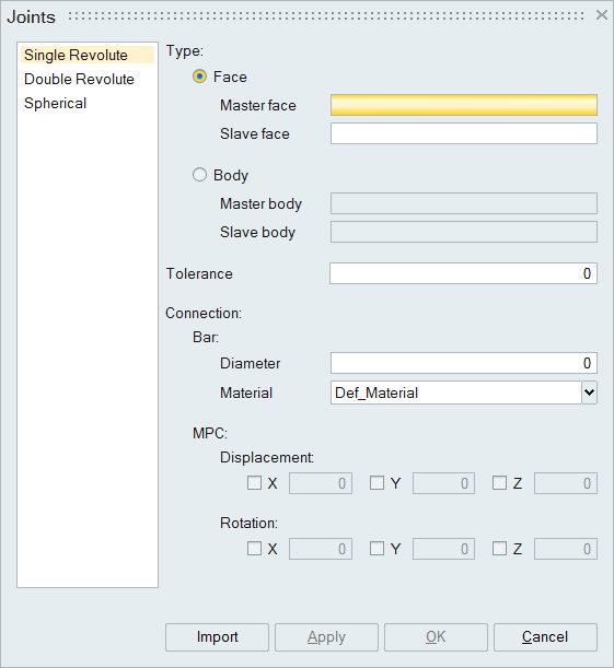 Joints can be modelled by selecting one face each from both master and slave body ("Face Based") or by directly selecting master and slave body ("Body Based"). Face from cylindrical faces of joint is to be selected for Face Based option. All other connected cylindrical faces will be identified automatically to model the joint. Body Based option will identify the matching coaxial cylinders and create joints. Revolute joints and spherical joints are modelled by creating master and slave RBE2 connected through bar and MPC.