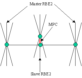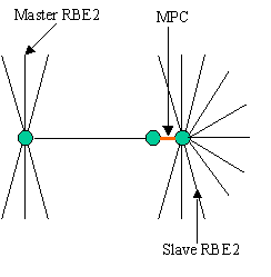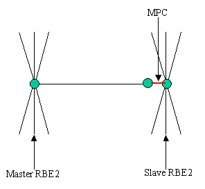 Center nodes of master RBE2 will be connected by 2 bar elements and the master node of slave RBE2 will be connected to the bar through MPC with local coordinate system having z axis through the axis of joint.