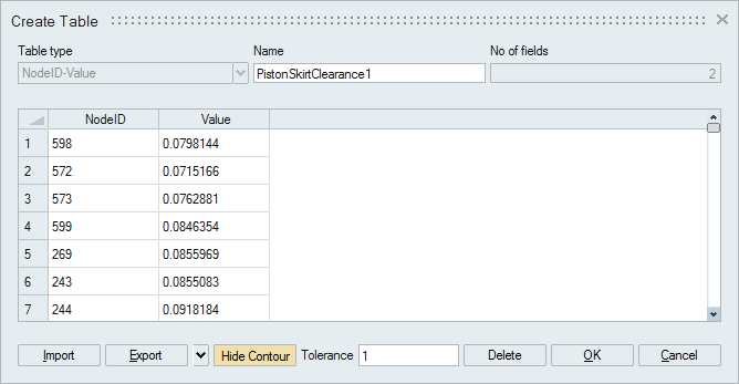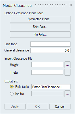 This tool is used to calculate the clearance value at each node on the piston skirt face using height and theta clearance table. The total clearance of a node is a sum of height clearance, theta clearance and the general clearance. The height clearance of a node is calculated using its height(z) and height table by spline interpolation method. Similarly the theta clearance of a node is calculated using its theta and theta table by spline interpolation method. The clearance values can be exported either as field table or in file.