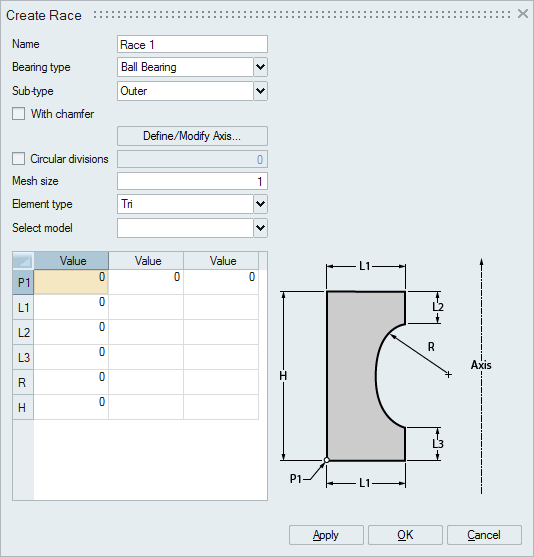 This tool is used to create bearing race for ball bearing, taper bearing and needle bearing using the given parameters. The race cross section type (outer or inner) can be selected and the corresponding geometry of the cross section is shown in the dialog box.