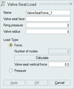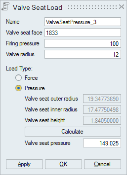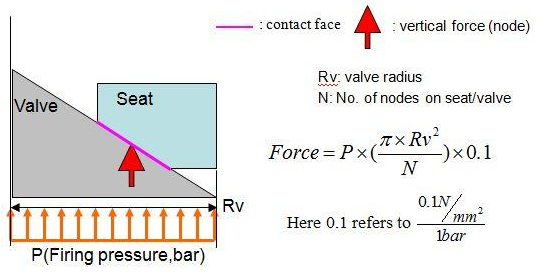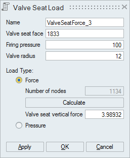 Select valve seat face, firing pressure and valve radius values. Choose the load type force or pressure to calculate valve seat load. For force load, enter the number of nodes on selected face and for pressure enter the radius and height values. Enter calculate button. Vertical force values / pressure values will be calculated and displayed. Enter Apply / OK button. Selected load will be created.