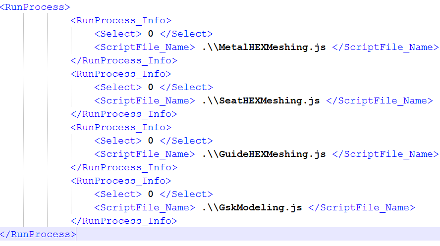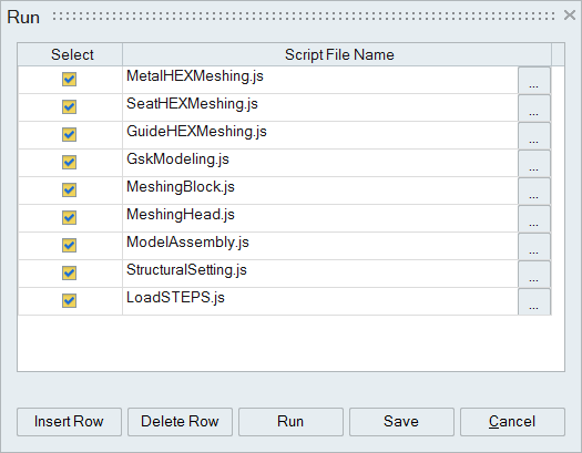 This option is used to list the scripts. These scripts can be selected and executed. This allows a process to stop and users to do manual operations before continuing with the rest of the process. This also allows users to break the complete process into sub process. An example is, where a thermal analysis script is to be run before a structural analysis run is performed which will require the results from thermal run. By click on the save button will save RunTemplate.xml file in the project folder. While opening the Run dialog next time, scripts present in the RunTemplate.xml file will be loaded in the Run dialog.