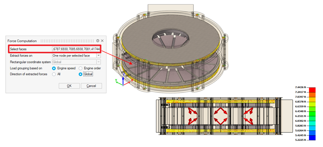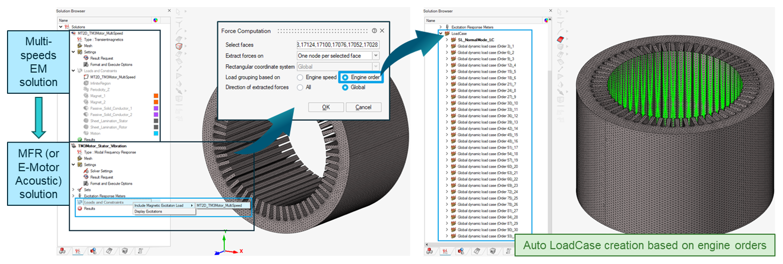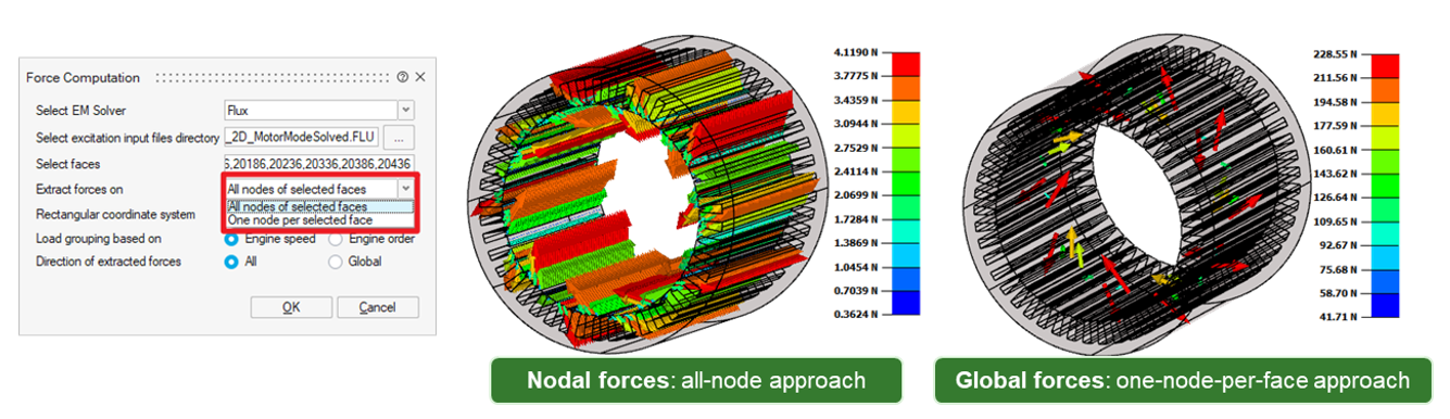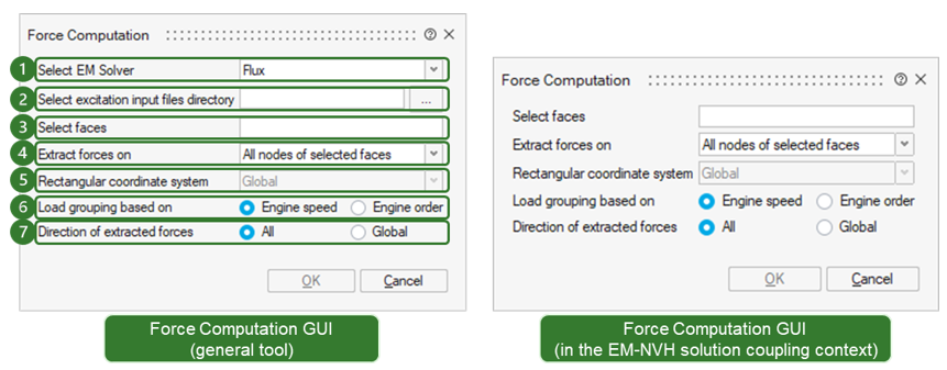 The GUIs of the force computation tool are shown below: as a general tool (left); in the EM-NVH solution coupling context (right):