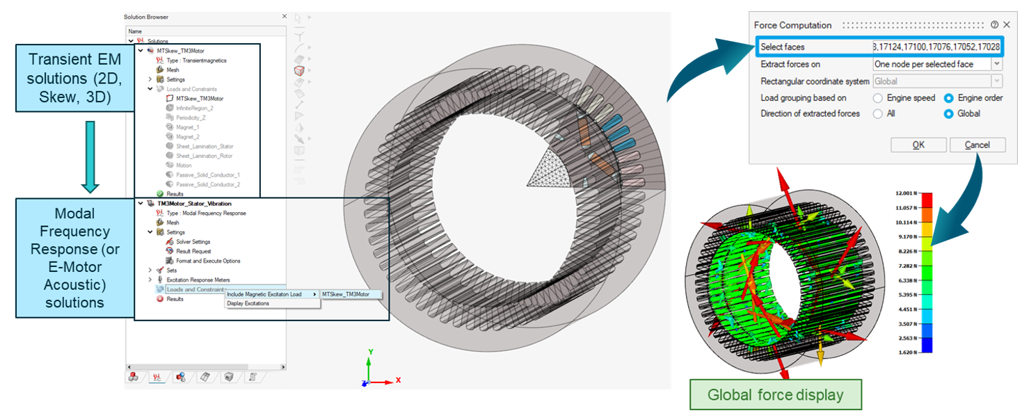 • SimLab supports a direct coupling of a Modal Frequency Response or an E-Motor Acoustic solution with a transient EM solution (2D, Skew or 3D). Once the EM solution gets solved, it can be used for the force computation in the following solution setting, as shown below: