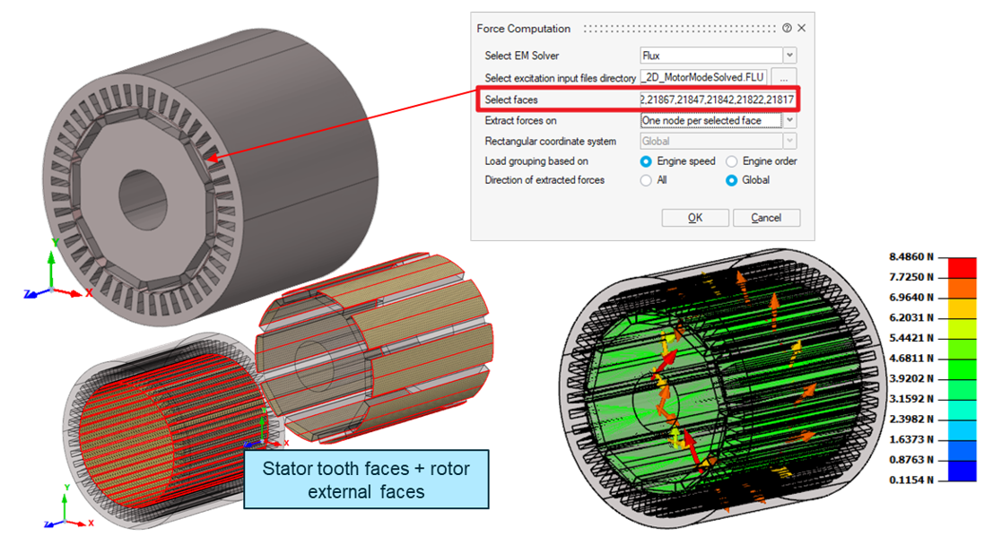 • Starting from SimLab 2025.1, it is possible to compute the electromagnetic forces from a 3D motor (e.g. axial flux machines) and convert them into SimLab LBCs.