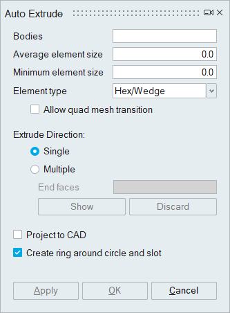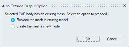 Auto extrude output option for different inputs- FE Body: The output mesh will be created in a new model.