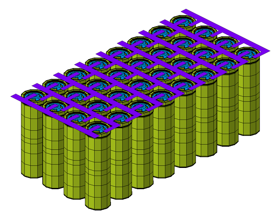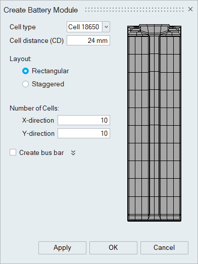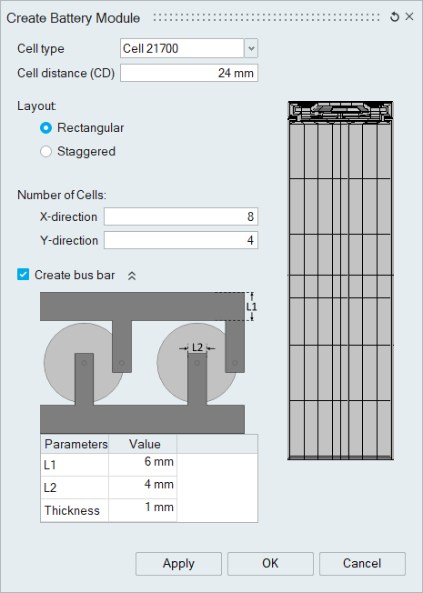 This tool is used to create an array of battery cells using cell templates 18650 and 21700. The cells can be created either in rectangular or staggered patterns. Default materials and thickness properties (for sheet bodies) will be auto assigned to the respective components.