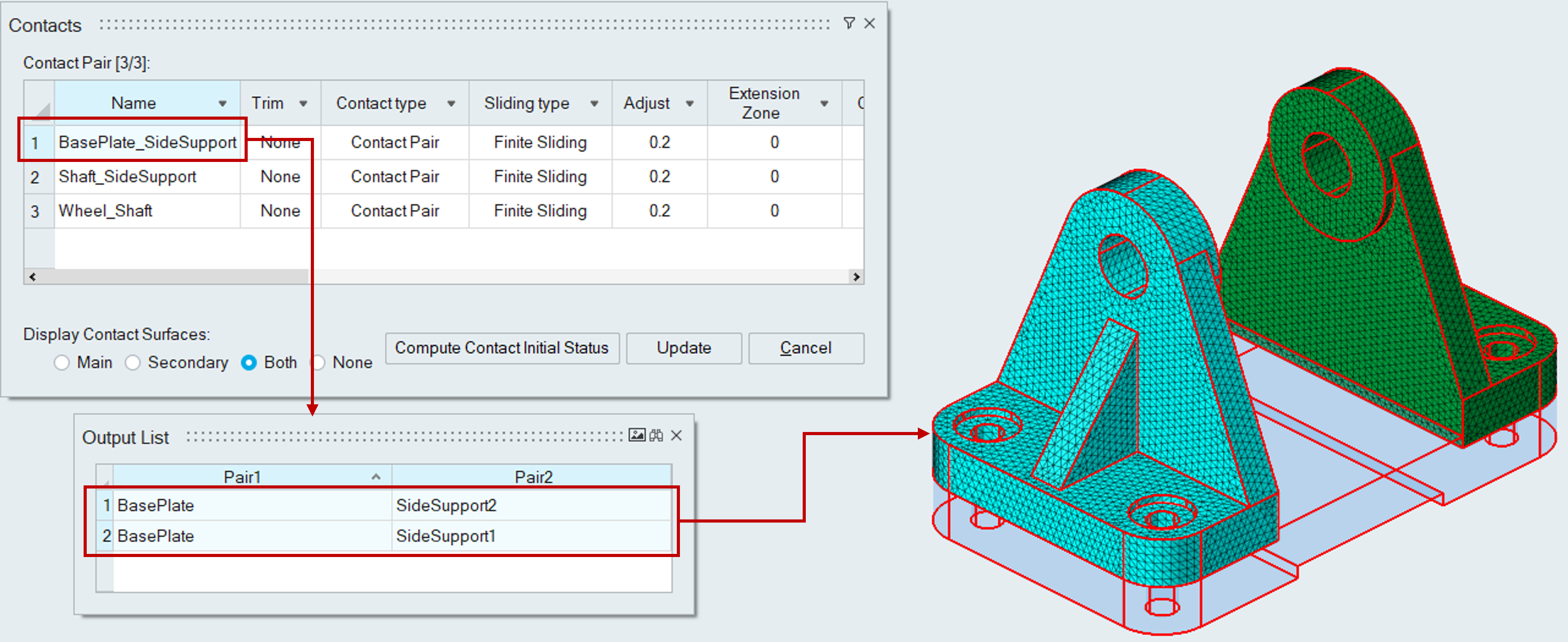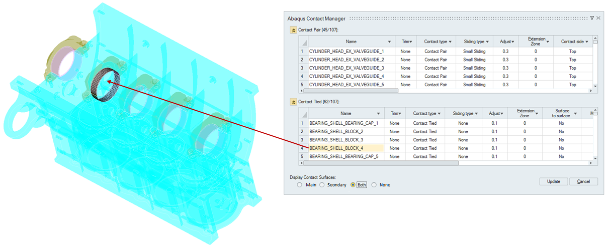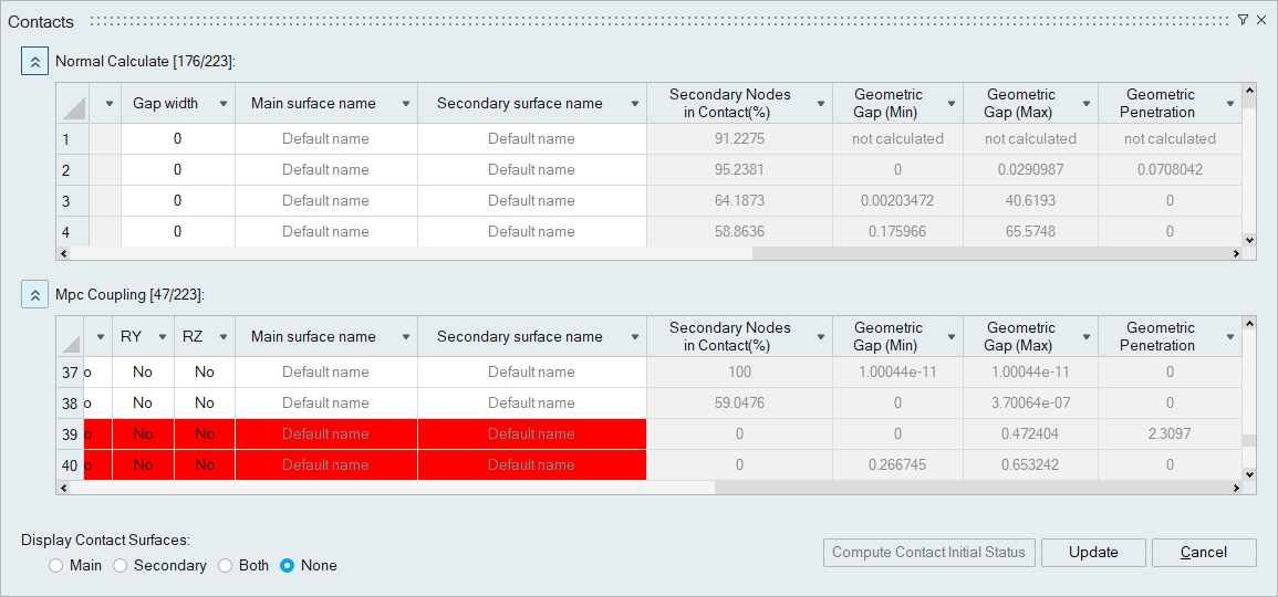 Selecting the contact "Name" cell will display the corresponding contact surface in the user interface.The “None” option used to avoid updating the graphical area to display the main and secondary entities for each contact.