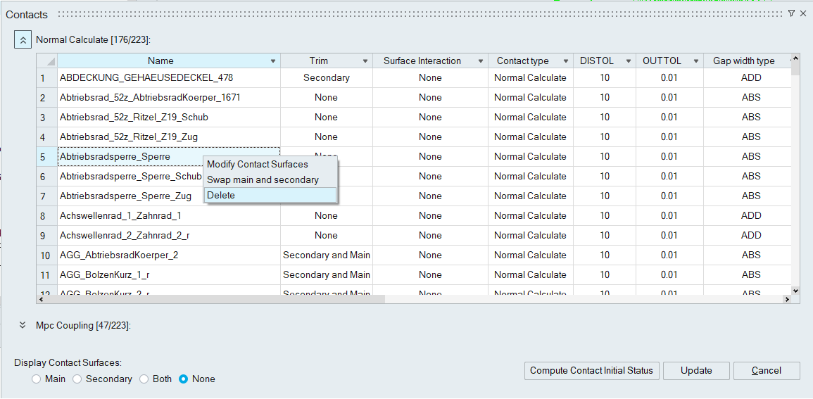 contact surfaces, Swap Main and Secondary and Delete.