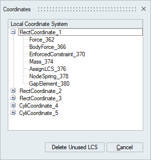 - Selecting the Coordinates name in the tree will highlight the entities of load in GUI.