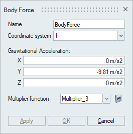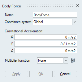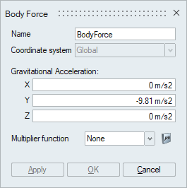 By default, the Gravitational Acceleration is 9.81 m/s2 in the negative Y direction. It can be specified in the desired direction using the X, Y and Z directional options.