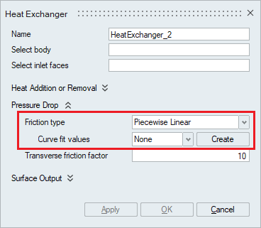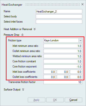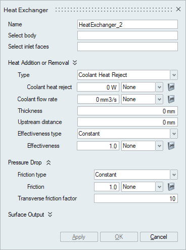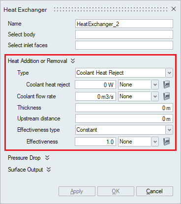 Typically, heat exchanger geometry is quite complex with large number of plates and pipes, and therefore it is not realistic to model the actual heat exchanger when performing system level simulations. In such scenarios, a simplified approach can be employed where only the effect of the heat exchanger on the cross flow is considered instead of modeling the actual heat exchanger. This is done using Heat Exchanger Component panel.