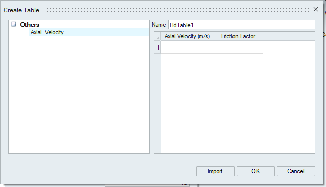 Create table panel is where the values could be typed in or a table could be imported by clicking on the import option. The Name option is used to rename the table containing the Piecewise Linear values. As shown below, the table consists of two columns. First column is Axial Velocity in the working units and the second column is the corresponding Friction Factor value. A new row can be created by clicking on one of the rows and hitting enter from the keyboard.