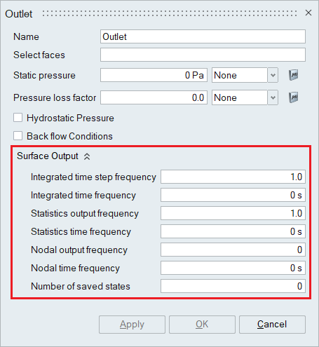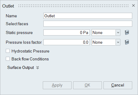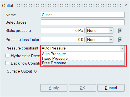 - Auto Pressure - The user specified pressure is used in subsonic flow, while the user specified pressure is ignored if it is lower than the computed pressure on the outflow surface.
