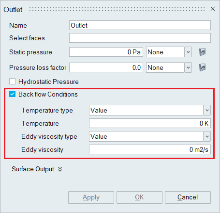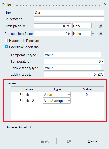 When the number of species is specified in the Solutions panel, the Species option becomes available in the outlet boundary condition panel when the backflow condition is enabled. The species value should be mentioned appropriately.