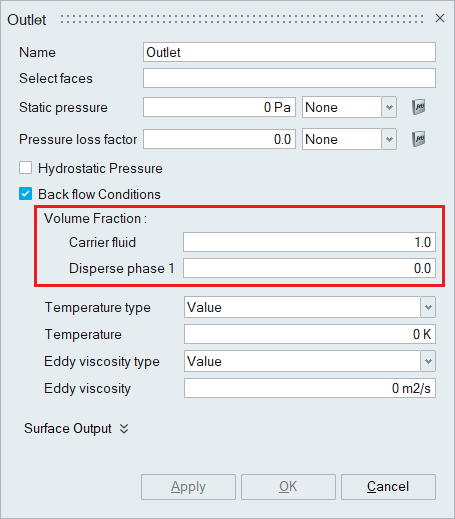 When the Disperse / Eulerian Multiphase flow type is chosen in the Solutions panel, the Volume fraction option becomes available in the outlet boundary condition panel when the backflow condition is enabled.