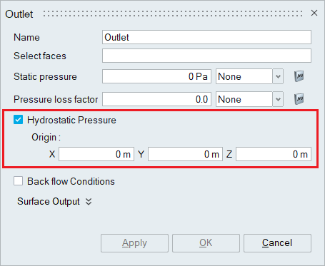 The coordinates of the origin of the body to which this flow boundary condition is assigned should be specified in the X, Y and Z options. You can also click on either X, Y, Z value location and select a node in the model for hydrostatic pressure origin.