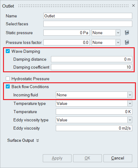 - Damping distance - Distance from the outlet surface where the damping source term is active.