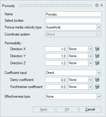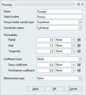 Porosity can be defined in Cartesian, Cylindrical and Spherical coordinate systems. A local coordinate system needs to be created to define Porosity for a body that is not aligned with the Global coordinate system. Global coordinate system (cartesian) is the only available option unless a local coordinate system is created using Create Coordinate System option.