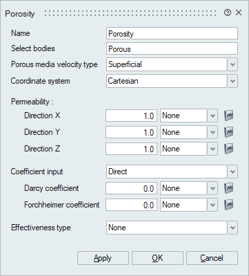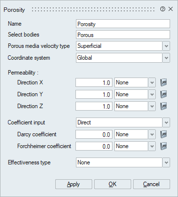 Permeability is a measure of the ease of flow of a fluid through a porous medium. The values in each of the directions depending on the selected coordinate system can be specified under the respective options.