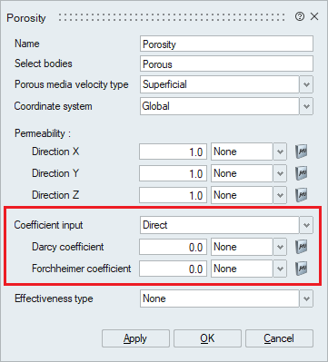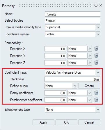 - Coefficient inputThe Darcy-Forchheimer coefficients can be applied using 2 methods.