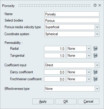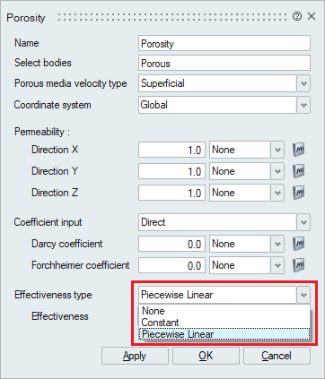 If the effectiveness type is set to Constant, then a constant value of effectiveness for the porous media should be provided. By default, the value is 1 which indicates 100% effectiveness.