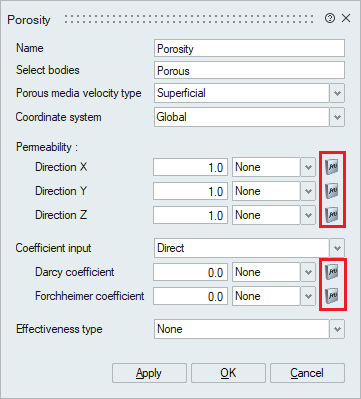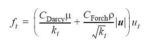 Where µ is the viscosity, the index i refers to one of the principal orthogonal directions, Cdarcy and Cforch are linear and quadratic coefficients of the porosity model, given by Darcy coefficient and Forchheimer coefficient and ki is the permeability in the principal direction i. The multiplier function can be used to uniformly scale the coefficient values.