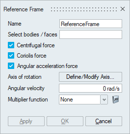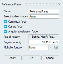 This option is used to define rotational frame of reference for selected bodies or faces. When the reference frame is applied, the bodies are solved in the given rotating reference frame and rotational body forces are added to them. When reference frame is applied to a face, the velocity vector is transformed appropriately before the boundary condition is applied.