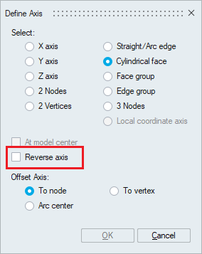 Select Define/Modify Axis to specify the axis of rotation. In the Define Axis panel, any of the displayed options can be used to define axis of rotation.