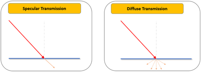 - Specular transmissivity (τs): Occurs when a photon passes straight through a surface with no change of direction.