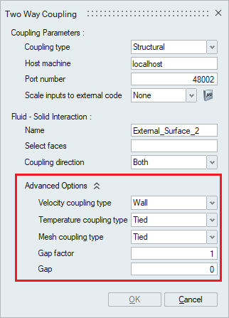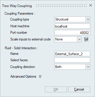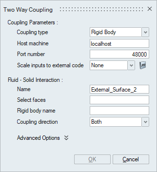 This panel takes inputs for setting up a two-way coupled simulation. The inputs to this panel are separated into 2 sections.