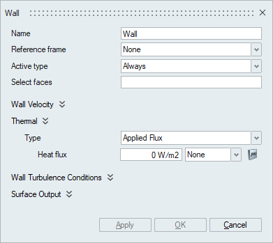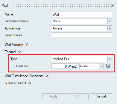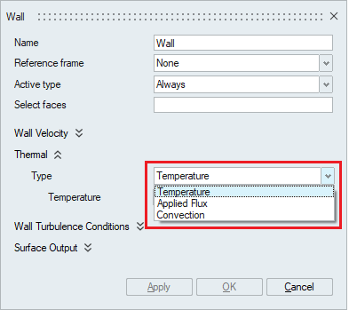 The Thermal wall boundary condition can be specified in terms of Temperature, Applied Flux and Convection.