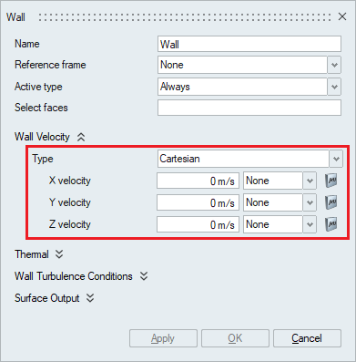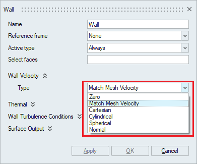 The velocity boundary condition for a wall type may be specified in six different ways, as determined by Wall Velocity Type. A value of Match Mesh Velocity is the default and requires no further data.
