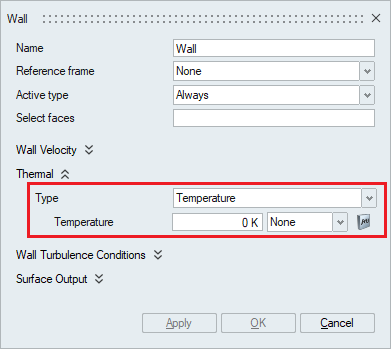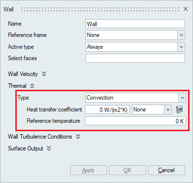 The Thermal option becomes available in the Wall panel when the Heat Transfer option is enabled in the Solutions panel.