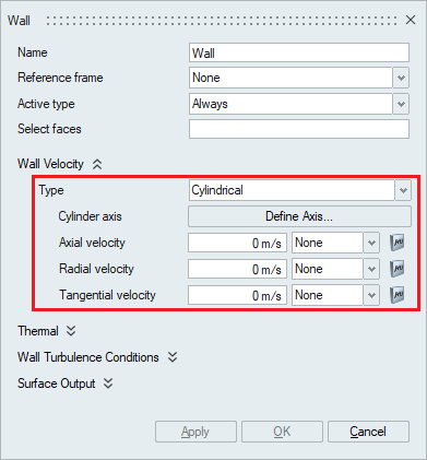 • A wall velocity type of Cylindrical sets boundary conditions on the axial, radial, and tangential components of the velocity in a cylindrical coordinate system. The Define Axis can be used to specify the axis of the cylinder.