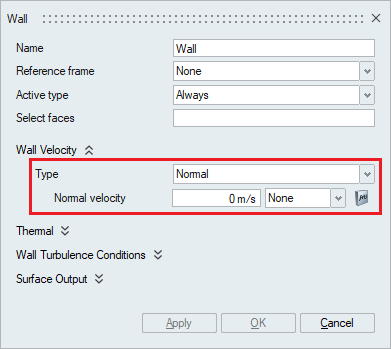 • A wall velocity type of Normal imposes a given boundary condition on the component of the velocity normal to the surface and zero boundary conditions on the other two components.
